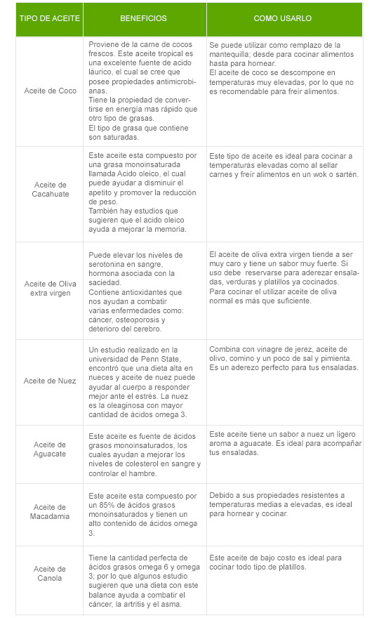 A continuación te presentamos una lista de los aceites de cocina más populares con sus beneficios y con recomendaciones de cuando usarlos.
