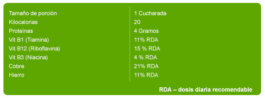 Entre el 55 al 70% de su composición es de proteína (un porcentaje mayor a la carne de res, pollo y soya). Es considerada como una de las pocas fuentes completas de proteína de origen vegetal, ya que contiene todos los amino ácidos esenciales que nuestro cuerpo necesita para sobrevivir, pero que no los puede producir por si mismo. También es fuente de Vitaminas A, B12, K, E, hierro, calcio, magnesio y fosforo. Las personas veganas y vegetarianas se pueden beneficiar mucho de su consumo, ya que para ellas es difícil cubrir su requerimiento de hierro.