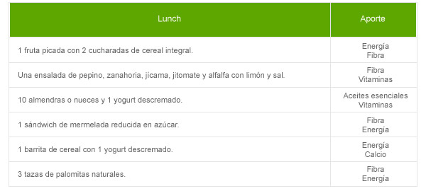- Procura que entre el desayuna y el lunch se incluyan cereales, lácteos, proteína, frutas y verduras.